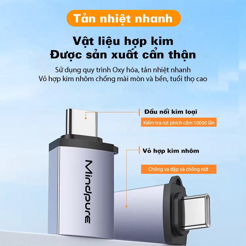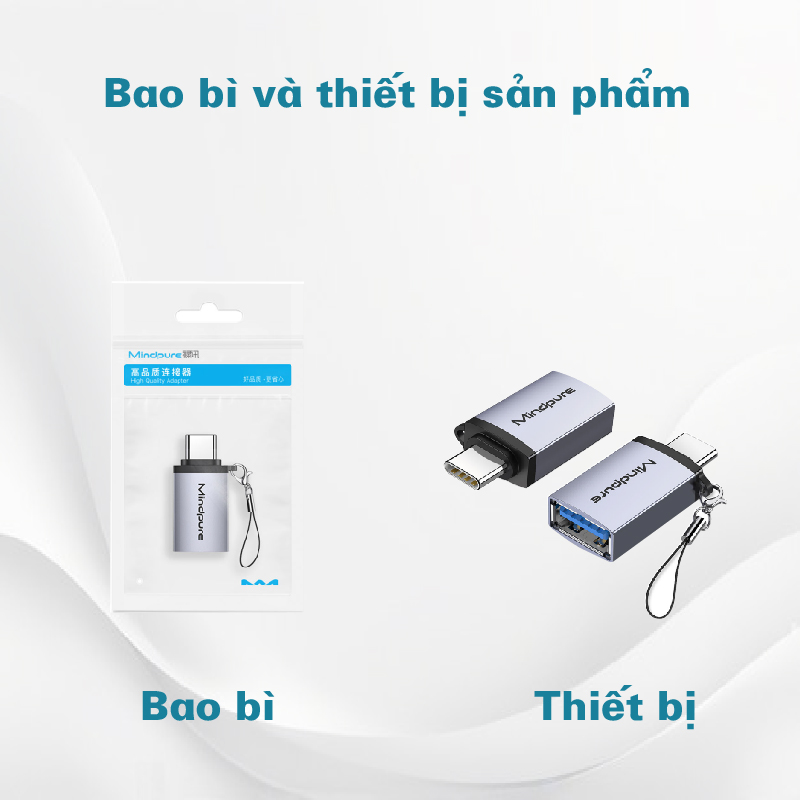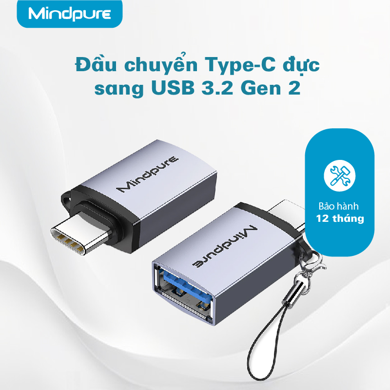 Bộ chuyển đổi Type-C sang USB 3.2 Gen2 Mindpure AD056 có thiết kế nhỏ gọn, vỏ hợp kim bền bỉ, hỗ trợ tốc độ truyền tải lên tới 900MB/s. Tương thích ngược USB 3.0/2.0 và hỗ trợ OTG, sản phẩm giúp kết nối nhanh chóng với điện thoại, laptop, tablet, USB… Dây đeo tiện lợi, chống thất lạc, lý tưởng cho mọi nhu cầu sử dụng di động.