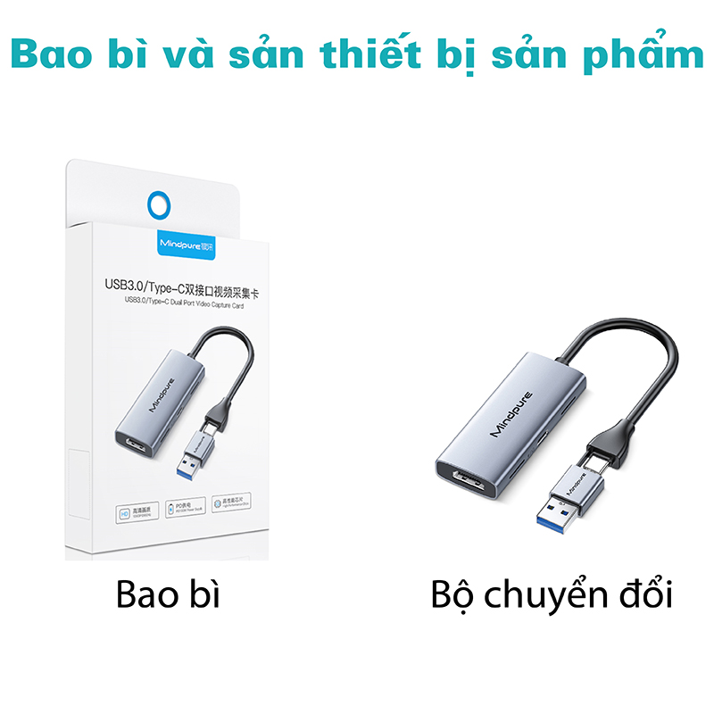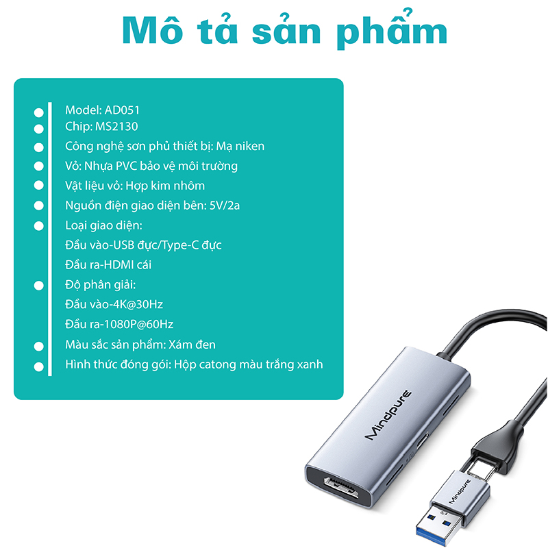 Bộ Hub chuyển đổi tín cổng Type C - USB 3.0 ra HDMI Mindpure AD067 là giải pháp hoàn hảo giúp kết nối nhanh chóng các thiết bị sử dụng giao diện Type-C hoặc USB 3.0 với màn hình HDMI. Sản phẩm hỗ trợ chuyển đổi tín hiệu và ghi hình đồng thời, phù hợp cho nhiều nhu cầu như họp trực tuyến, stream game, giáo dục trực tuyến, v.v