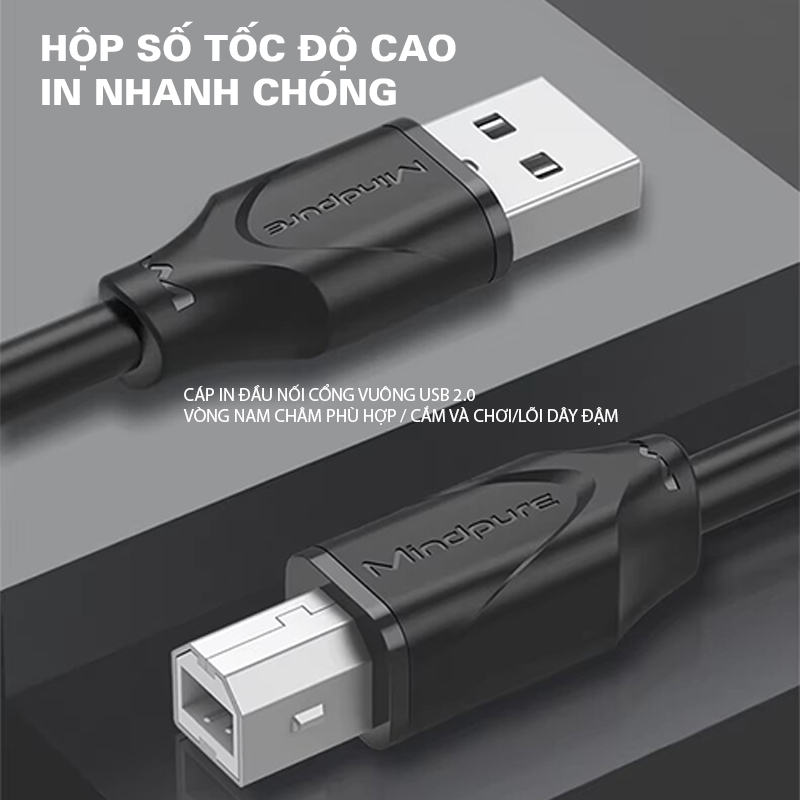 Cáp USB 2.0 AM-BM Mindpure US002 là một trong những lựa chọn tối ưu dành cho những người dùng cần một giải pháp kết nối bền bỉ và đáng tin cậy cho thiết bị in ấn. Với chất liệu lõi đồng không oxy, lớp bảo vệ tối ưu và khả năng tương thích rộng rãi với các máy in USB đầu vuông, cáp này không chỉ cung cấp tốc độ truyền dữ liệu nhanh chóng mà còn đảm bảo quá trình in ấn ổn định và an toàn.