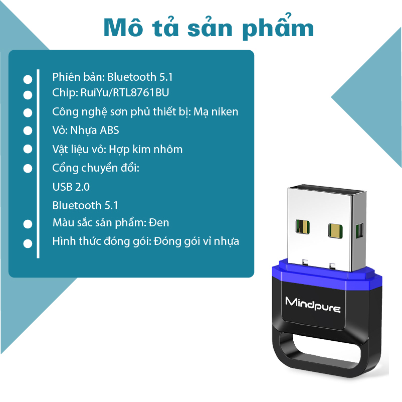 Cổng chuyển đổi USB 2.0 sang Bluetooth 5.1 Mindpure US020 sử dụng chip RuiYu/RTL8761BU, hỗ trợ Bluetooth 5.1 với kết nối ổn định trong phạm vi 30m và khả năng kết nối cùng lúc 7 thiết bị. Vỏ nhựa ABS bền bỉ, bề mặt mạ niken tăng độ bền. Tương thích Windows Vista, 7, 8, 10 (Windows 7 cần trình điều khiển). Sản phẩm đạt chứng nhận SSRC, đảm bảo chất lượng và hiệu suất vượt trội.