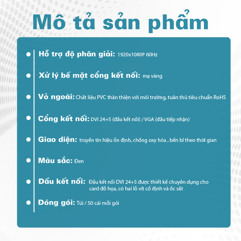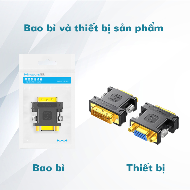 Đầu chuyển DVI 24+5 đực sang VGA cái Mindpure AD050 hỗ trợ độ phân giải Full HD 1080P@60Hz, giao diện mạ vàng cho tín hiệu ổn định. Thiết kế chắc chắn với ốc vít cố định, chuyên dùng cho card đồ họa DVI-I. Chất liệu PVC thân thiện môi trường, đạt chuẩn RoHS, phù hợp cho văn phòng, phòng máy và lắp đặt chuyên nghiệp.