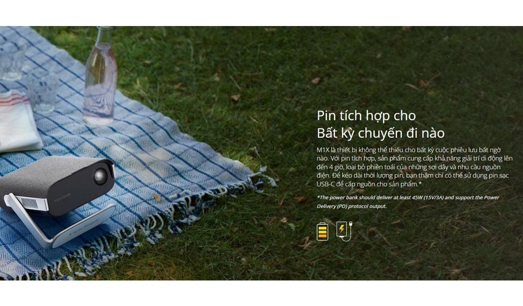Máy được trang bị pin tích hợp cho thời gian sử dụng lên đến 4 giờ, đáp ứng trọn vẹn nhu cầu xem phim, nghe nhạc hay trình chiếu ngắn. Đặc biệt, M1X còn hỗ trợ cấp nguồn qua pin sạc dự phòng USB-C (chuẩn PD), lý tưởng cho các chuyến đi xa.