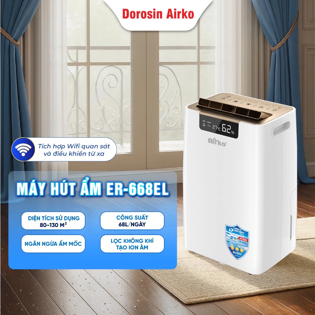 Máy hút ẩm Airko ER-668EL là thiết bị hút ẩm công suất lớn với khả năng hút ẩm 68 lít/ngày, phù hợp cho không gian từ 80 – 130m² như kho xưởng, phòng server, phòng sản xuất hoặc văn phòng lớn. Máy được trang bị máy nén GMCC/Panasonic, lưu lượng gió lớn và hệ thống thoát nước liên tục, giúp vận hành ổn định trong thời gian dài.