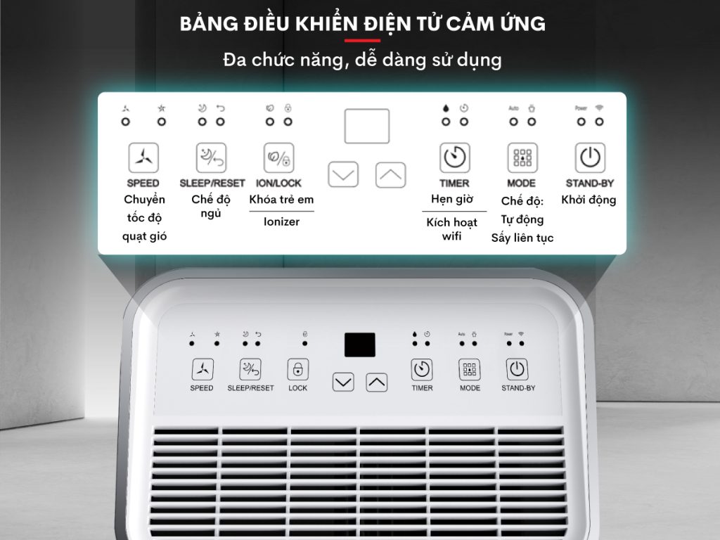 Máy hút ẩm Fujihome DH20W là lựa chọn lý tưởng cho những không gian rộng cần công suất hút ẩm mạnh mẽ, vận hành ổn định và điều khiển thông minh. Với bình chứa nước siêu lớn 6.5L, kết nối Wifi tiện lợi và tích hợp Ionizer lọc không khí, sản phẩm không chỉ giúp kiểm soát độ ẩm mà còn nâng cao chất lượng không khí trong nhà.