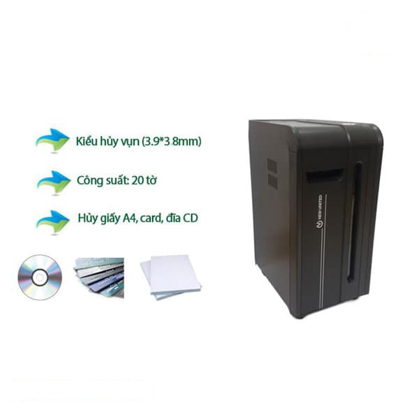Máy hủy tài liệu New United ET-20C là thiết bị hủy giấy công suất lớn, lý tưởng cho văn phòng, doanh nghiệp và tổ chức cần xử lý tài liệu bảo mật cao. Với khả năng hủy lên đến 20 tờ/lần, kiểu hủy vụn kích thước 3,9 x 38mm, máy đảm bảo tiêu hủy triệt để thông tin nhạy cảm. ET-20C còn có thể hủy thẻ tín dụng, kim bấm, ghim kẹp tiện lợi. Chu kỳ hoạt động liên tục 20 phút, tốc độ hủy nhanh, thùng chứa lớn 31,4 lít cùng các tính năng chống quá nhiệt, quá tải, đảo chiều thông minh giúp máy vận hành bền bỉ và an toàn.