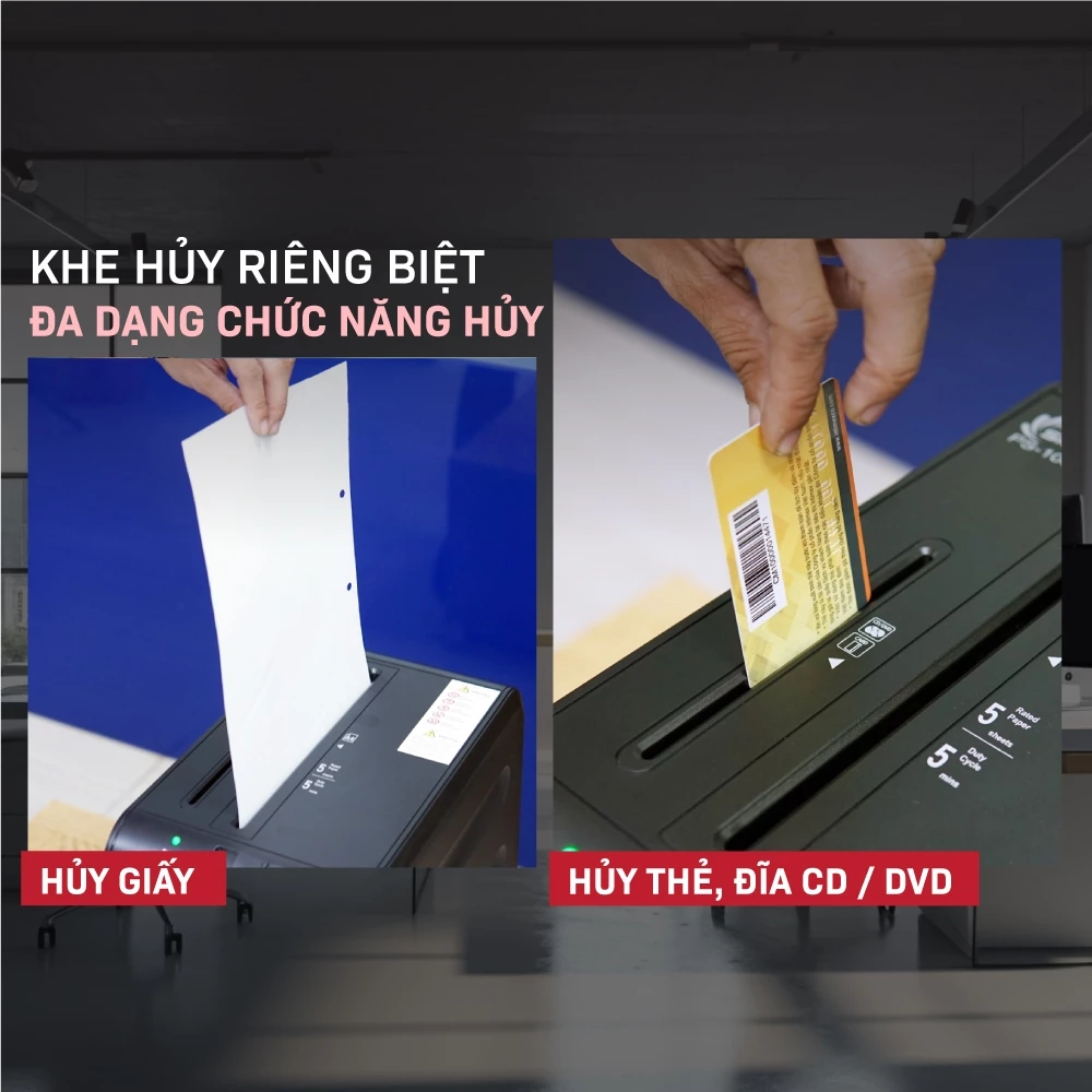 Không chỉ hủy giấy thông thường, PS-1005C còn có khả năng hủy thẻ tín dụng và đĩa CD/DVD, giúp người dùng xử lý triệt để các nguồn thông tin khác nhau. Đây là một điểm cộng lớn khi nhu cầu bảo mật không chỉ dừng lại ở tài liệu giấy mà còn mở rộng sang các thiết bị lưu trữ dữ liệu.