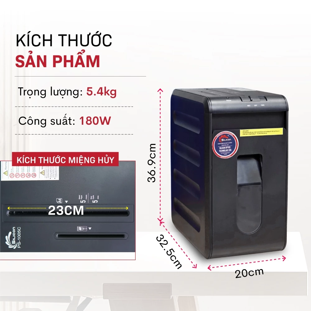 Silicon PS-1005C là dòng máy hủy tài liệu nhỏ gọn nhưng mạnh mẽ, đáp ứng tốt nhu cầu bảo mật thông tin cơ bản cho cá nhân và văn phòng nhỏ. Liên hệ ngay để được tư vấn chi tiết và nhận báo giá tốt nhất!