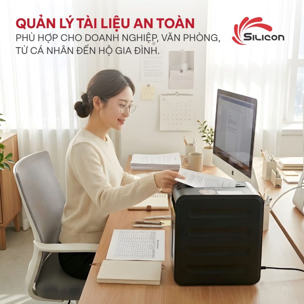Silicon PS-1008C là máy hủy tài liệu nhỏ gọn, đa năng với khả năng hủy vụn 8 tờ/lần, hỗ trợ tiêu hủy giấy, thẻ tín dụng và CD/DVD tiện lợi. Máy vận hành êm ái, tích hợp nhiều tính năng an toàn như chống kẹt giấy, bảo vệ quá tải và tự động dừng, rất phù hợp cho cá nhân và văn phòng nhỏ cần giải pháp bảo mật thông tin hiệu quả.