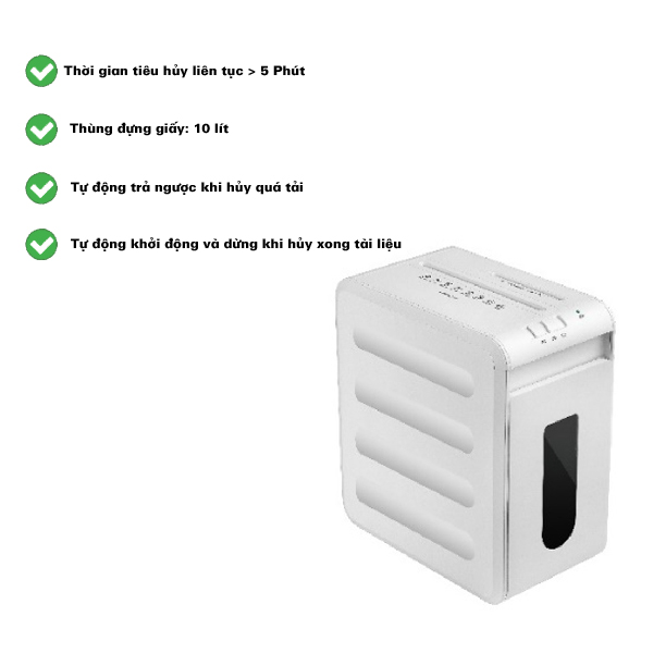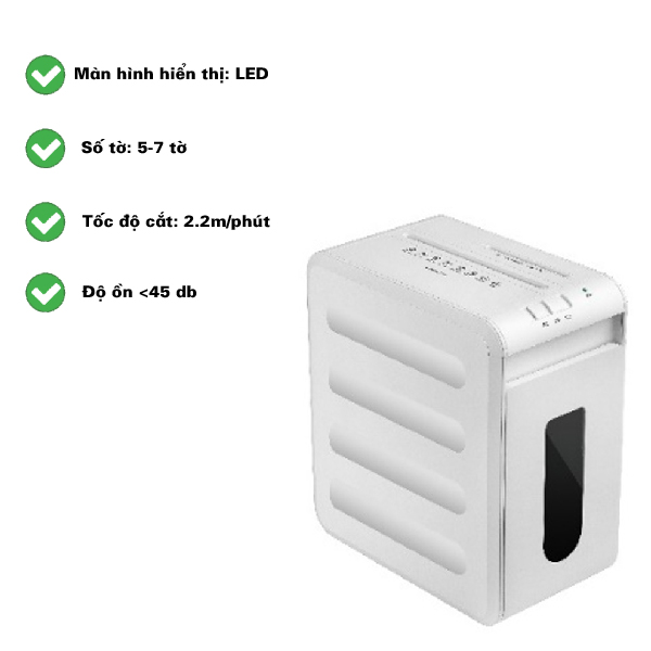 Máy được trang bị màn hình LED hiển thị trực quan, giúp người dùng dễ dàng theo dõi trạng thái hoạt động. Hệ thống tự động khởi động và dừng khi huỷ xong, đồng thời có chức năng trả ngược giấy tự động khi quá tải, bảo vệ motor, hạn chế kẹt giấy và kéo dài tuổi thọ thiết bị.