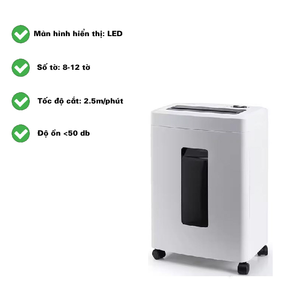 Máy có khả năng huỷ 8–12 tờ mỗi lần (A4, A5 – 70gsm) với tốc độ 2,5m/phút, cho phép xử lý nhanh khối lượng tài liệu lớn. Thời gian huỷ liên tục trên 8 phút giúp máy vận hành ổn định trong giờ cao điểm, trong khi cơ chế tự ngắt khi motor quá nhiệt đảm bảo an toàn và kéo dài tuổi thọ thiết bị.