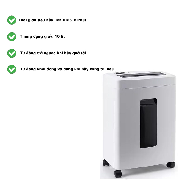 Thùng chứa dung tích 16 lít cho phép huỷ được nhiều tài liệu trước khi cần đổ rác, giảm gián đoạn trong quá trình sử dụng. Với kích thước 330 × 225 × 490mm và trọng lượng 7,8kg, máy phù hợp với nhiều không gian làm việc khác nhau.