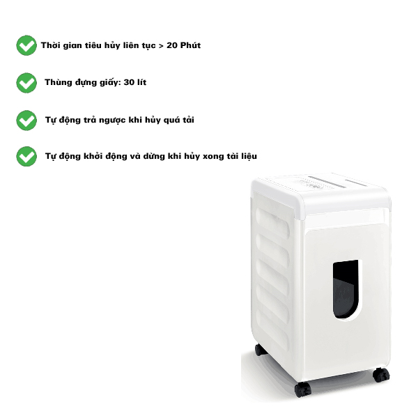 Thời gian huỷ liên tục trên 20 phút, kết hợp cơ chế tự ngắt khi motor quá nhiệt, giúp bảo vệ máy và đảm bảo độ bền trong quá trình sử dụng. Đây là ưu điểm lớn đối với các doanh nghiệp thường xuyên phải huỷ số lượng lớn tài liệu mỗi ngày.